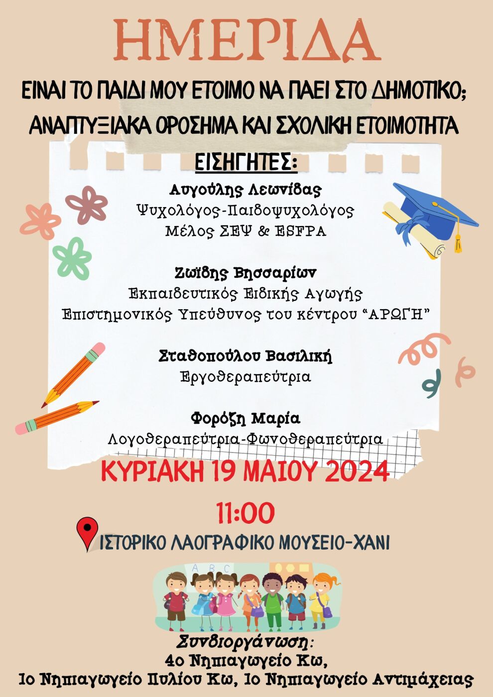 Ημερίδα για τη σχολική ετοιμότητα από το 4ο Νηπιαγωγείο Κω, το 1ο Νηπιαγωγείο Πυλίου και το 1ο Νηπιαγωγείο Αντιμάχειας , με εισηγητές τους Λεωνίδα Αυγούλη (Ψυχολόγο-Παιδοψυχολόγο), Βησσαρίων Ζωίδης (Εκπαιδευτικός Ειδικής Αγωγής), Βασιλική Σταθοπούλου ( Εργοθεραπεύτρια) και Μαρία Φορόζη (Λογοθεραπεύτρια), την Κυριακή 19 Μαϊου στις 11:00 στο Χάνι.