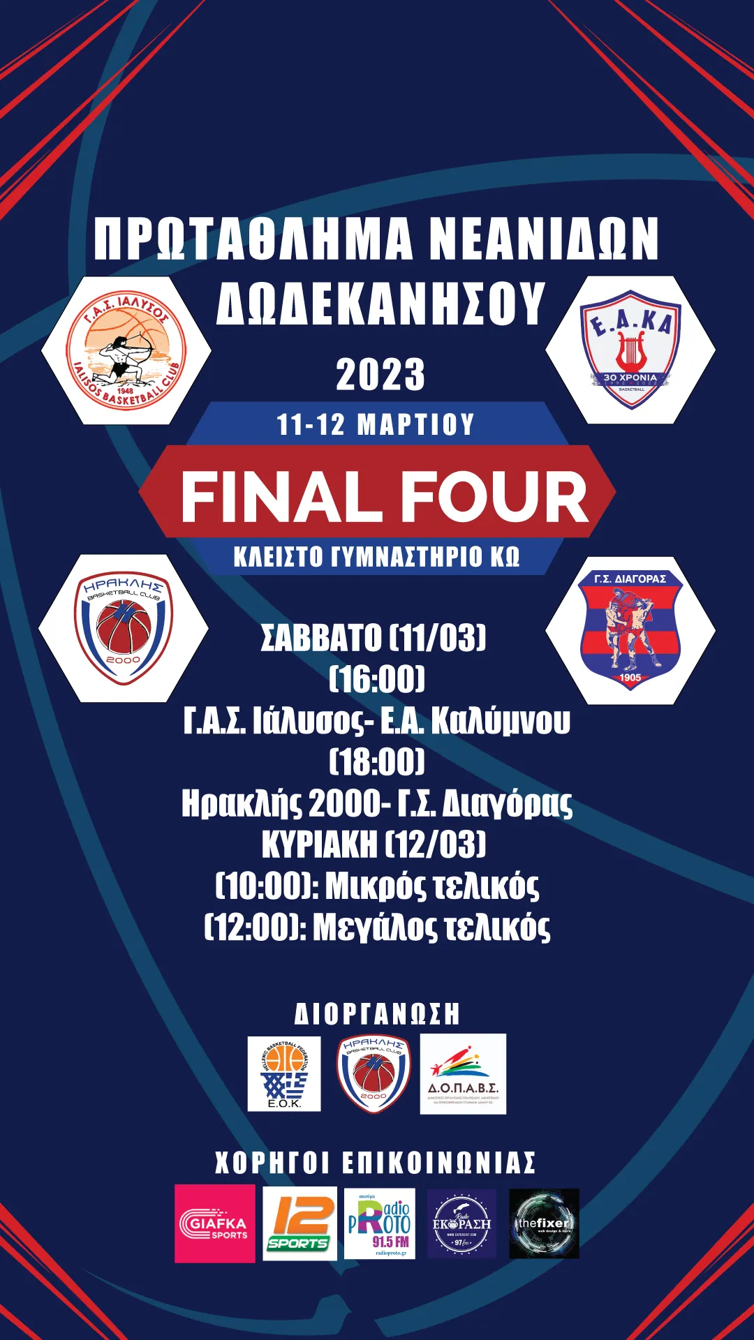 Οι αθλητές, οι προπονητές και το διοικητικό συμβούλιο του αθλητικού συλλόγου Ηρακλής 2000, σας προσκαλούν να παρευρεθείτε στο κλειστό γυμναστήριο Κω όπου θα πραγματοποιηθεί το final 4 του πρωταθλήματος νεανίδων Δωδεκανήσου την Παρασκευή 10/03 και το Σάββατο 11/03.