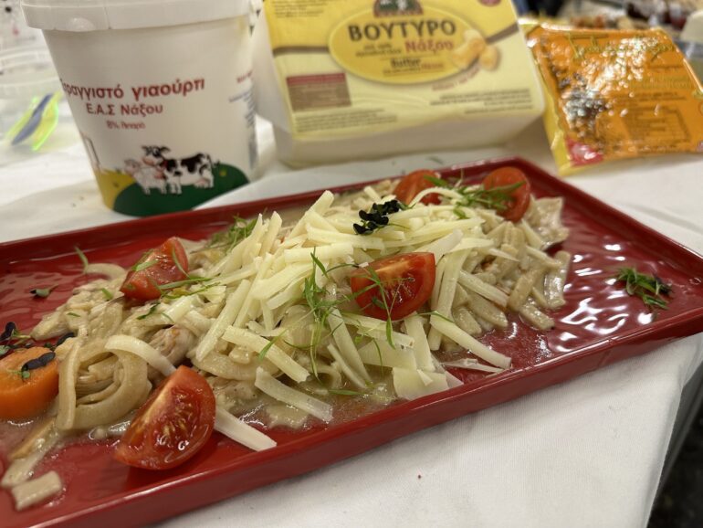 Κουλουρία με κατσίκι και γραβιέρα Νάξου, τραχανώτο με κοτόπουλο και τυρί Σαν Μιχάλη, αλμυροί λουκουμάδες, κρεμμυδόπιτα Μυκόνου, μπαρμπούνι φιλέτο με δενδρολίβανο, πιταρούδια με κρεμμύδι και κύμινο, σαλάτα με αλίπαστα και εσπεριδοειδή, μους κολιού κ.α. Η Ροδίτικη λαδόπιτα δοκιμάστηκε με μαρμελάδες Νάξου και Ρόδου. Χωριάτικο ψωμί στον ξυλόφουρνο, πευκόμελο Ρόδου, τυριά Σύρου, αλίπαστα Λέρου, μεταξύ άλλων έδωσαν το στίγμα του κάθε τόπου, το DNAτων ανθρώπων, τον τρόπο ζωής τους, τον πολιτισμό, τις αξίες της φιλοξενίας, τους δεσμούς της οικογένειας.