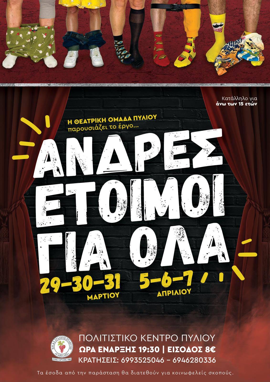 Η θεατρική ομάδα Πυλίου παρουσιάζει το έργο «ΆΝΔΡΕΣ ΈΤΟΙΜΟΙ ΓΙΑ ΌΛΑ» με έξι παραστάσεις που θα πραγματοποιηθούν στο Πολιτιστικό Κέντρο Πυλίου στις 29 – 30 – 31 Μαρτίου και 5 – 6 -7 Απριλίου και ώρα 19:30.