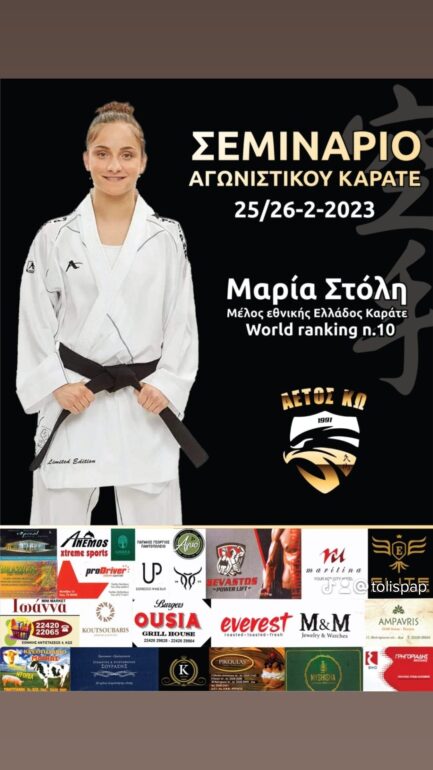 Στις 25/26-2-2023 την σχολή Αετός Κω, θα επισκεφθεί η νεαρή ταλαντούχα αθλήτρια Μαρία Στόλη, ενεργό μέλος της εθνικής Ελλάδος Καράτε. Το σεμινάριο απευθύνεται σε αθλητές του συλλόγου Αετός Κω και είναι ενταγμένο στα πλαίσια των διοργανώσεων για το έτος 2023. Η αθλητές μας, μετά από δυο χρόνια αδράνειας κατάφεραν να αποκτήσουν ξανά το μέγιστο φυσιολογικό επίπεδο και πέραν των καθημερινών ατομικών προπονήσεων, έχουν μπεί στο κυνήγι των μεταλλίων. Συνεπώς, οι δράσεις μας αποκτούν ξανά ενδιαφέρον και μας ενεργοποιούν τα αντανακλαστικά. Με αυτό τον τρόπο η ομάδα μας θα μεταβεί στην πρωτεύουσα της Αθήνας όπου θα λάβει μέρος στο πανελλήνιο πρωτάθλημα παίδων – κορασίδων που θα διεξαχθεί στο ΟΑΚΑ, κατά τον μήνα Μάρτιο. Σε κάθε άλλη περίπτωση είναι σημαντικό να μην ξεχνάμε όλους εκείνους που ειναι δίπλα μας και μας δίνουν δύναμη με το δικό τους τρόπο, τους οποίους και ευχαριστούμε θερμά.