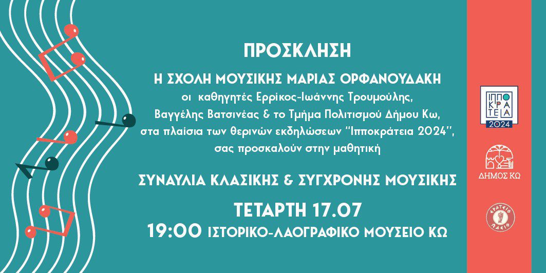 Στο πλαίσιο των θερινών πολιτιστικών εκδηλώσεων «Ιπποκράτεια 2024» το Τμήμα Πολιτισμού Δήμου Κω σας ενημερώνει για τις προσεχείς εκδηλώσεις:
