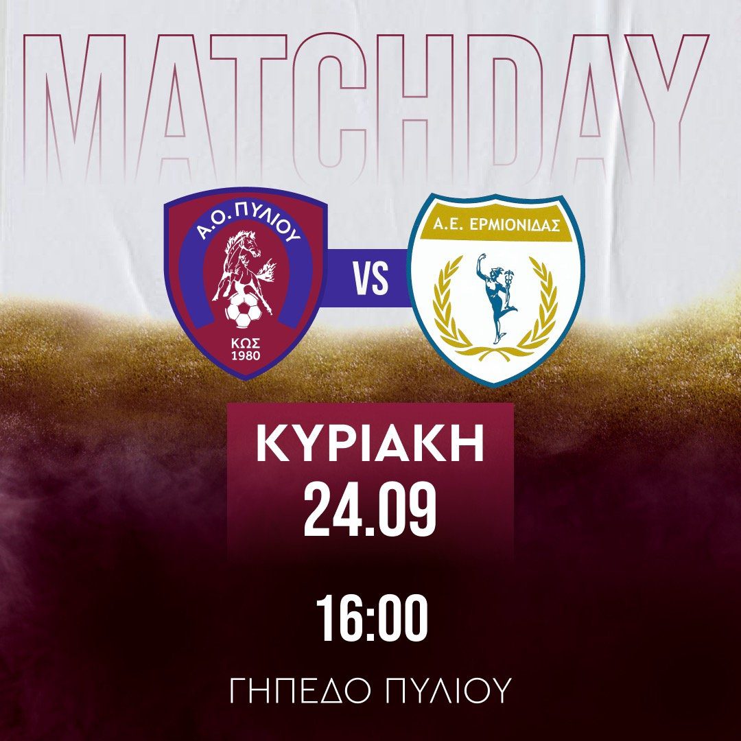 Για την 3η αγωνιστική της Γ’ Εθνικής (3ος Όμιλος) η ομάδα μας υποδέχεται την Κυριακή 24/9 στις 16:00 την Α.Ε Ερμιονίδας στο γήπεδο Πυλίου. Καλούμε όλο το φίλαθλο κοινό να δώσει δυναμικό παρών και όλοι μαζί να βοηθήσουμε τον Α.Ο Πυλίου να ξεκινήσει με νίκη της αγωνιστικές του υποχρεώσεις και εντός έδρας.