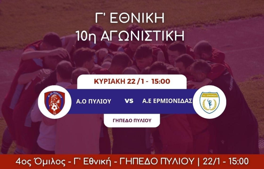 Ο Αθλητικός Όμιλος Πυλίου καλεί το φίλαθλο κοινό να δώσει δυναμικό παρών στο ματς της Κυριακής 22 Ιανουαρίου στις 15:00 απέναντι στην ομάδα της Α.Ε Ερμιονίδας για την 10η αγωνιστική της Γ’ Εθνικής (4ος Όμιλος). Με την στήριξη σας θέλουμε να συνεχίσουμε στον δρόμο των επιτυχιών.