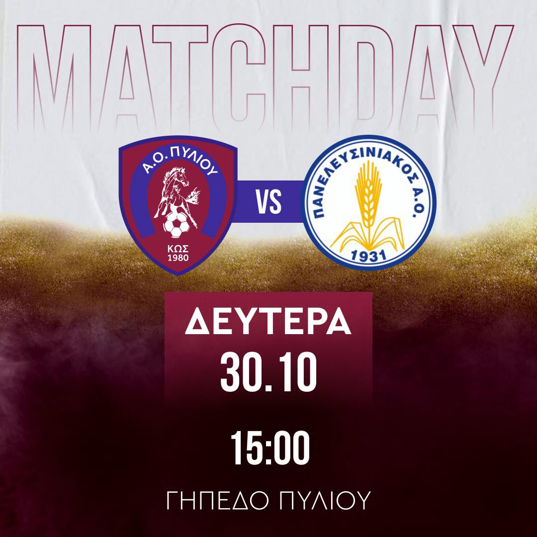 Για την 8η αγωνιστική του πρωταθλήματος της Γ’ Εθνικής (3ος Όμιλος) ο Α.Ο Πυλίου υποδέχεται στο Δημοτικό γήπεδο Πυλίου «Δημήτρης Ρούφας» τον Πανελευσινιακό. Καλούμε το φίλαθλο κοινό να δώσει δυναμικό παρών την Δευτέρα στις 15:00 και όλοι μαζί να πανηγυρίσουμε την επιστροφή μας στα νικηφόρα αποτελέσματα.