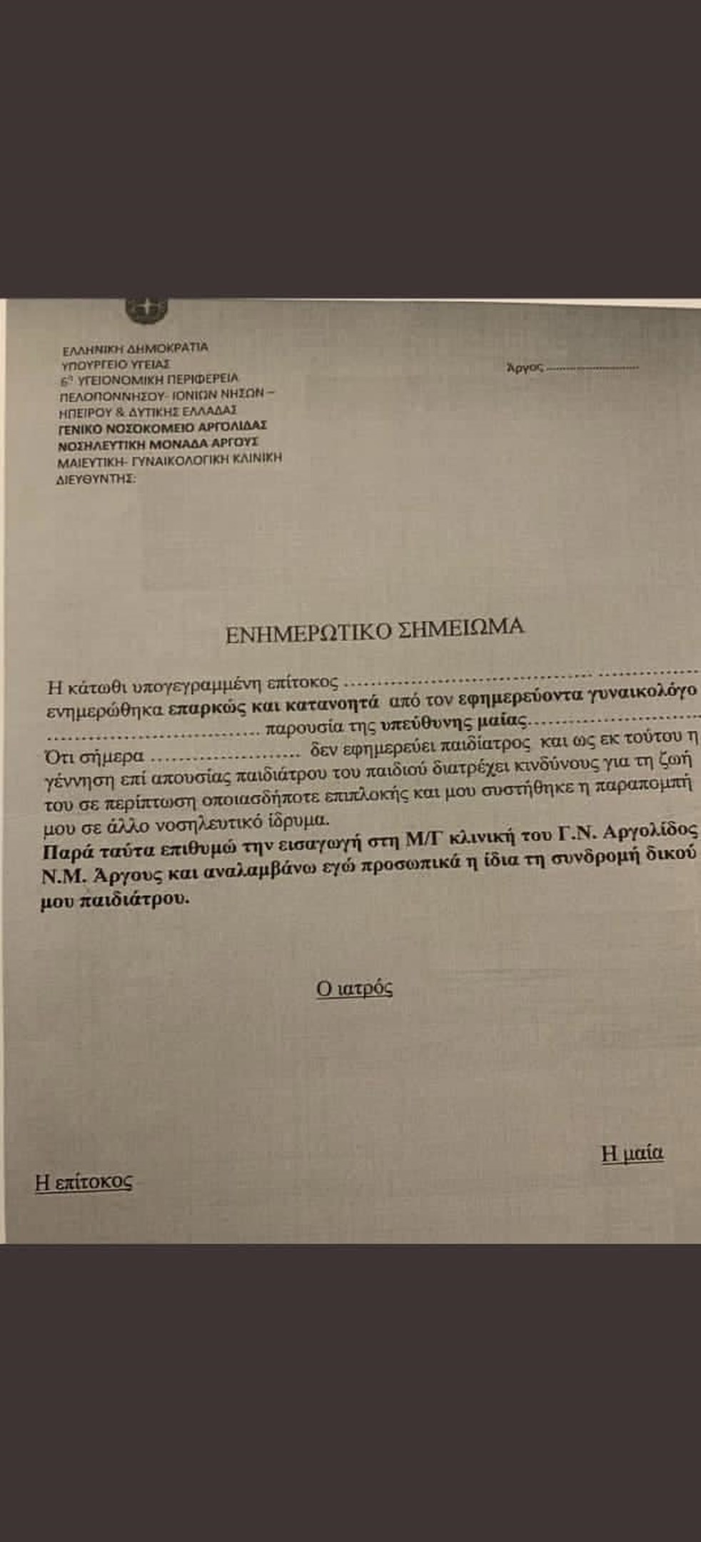 Την ώρα που το μεγαλύτερο ογκολογικό νοσοκομείο της χώρας, το “Μεταξά”, έχει μείνει χωρίς φαρμακείο, η διοίκηση του γενικού νοσοκομείου Αργολίδας ζητά από τις επιτόκους να κάνουν υπεύθυνη δήλωση ότι θα εισαχθούν και θα γεννήσουν με δικό τους ιδιώτη παιδίατρο(!), γιατί το νοσοκομείο δεν έχει εφημερεύοντα παιδίατρο και δεν αναλαμβάνει την ευθύνη για οπαιδήποτε επιπλοκή και έκθεση σε κίνδυνο της ζωής του νεογνού!