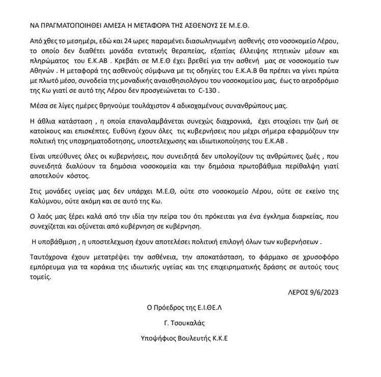 Share Facebook Twitter LinkedIn Pinterest Email Παραθέτουμε παρακάτω καταγγελία του υποψήφιου βουλευτή ΚΚΕ και προέδρου της Ε.Ι.ΘΕ.Λ Γ.Τσουκαλά για μεταφορά ασθενούς σε Μ.Ε.Θ από Λέρο Λέρος