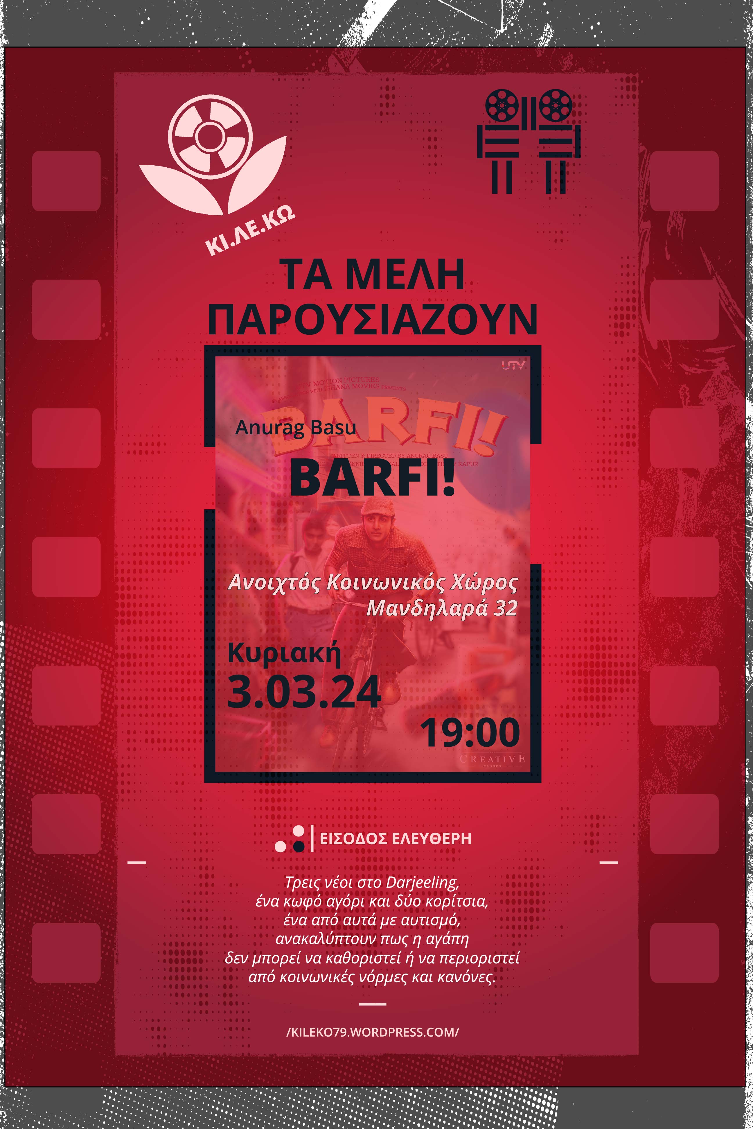 H ΚΙ.ΛΕ.ΚΩ συνεχίζει και τη νέα χρονιά τη δράση προβολών Τα μέλη παρουσιάζουν, στον φιλόξενο Ανοιχτό Κοινωνικό Χώρο Μανδηλαρά 32, όπου κάθε μέλος έχει την ευκαιρία να παρουσιάσει και να ανοίξει συζήτηση για μια αγαπημένη του ταινία, μοιράζοντας έτσι τις εμπειρίες, τις σκέψεις και τα συναισθήματά του με όλους εμάς. Σας περιμένουμε την Κυριακή 3/03 στις 19:00, με την Ινδική ρομαντική κωμωδία, Barfi.