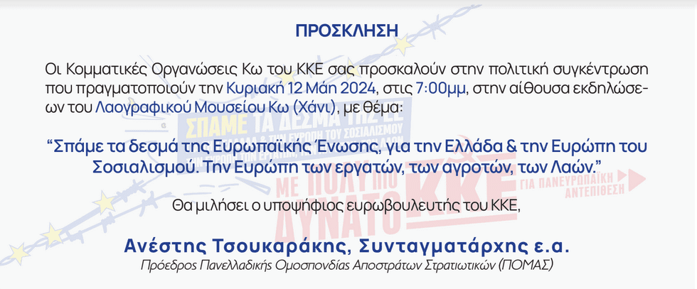 Πρόσκληση των Κομματικών Οργανώσεων Κω του ΚΚΕ για την πολιτική συγκέντρωση που διοργανώνουν ενόψει των Ευρωεκλογών, την Κυριακή 12 Μαΐου, στις 7:00μμ, στο Χάνι. Ομιλητής θα είναι ο Ανέστης Τσουκαράκης, Συνταγματάρχης ε.α. & Πρόεδρος Πανελλαδικής Ομοσπονδίας Αποστράτων Στρατιωτικών (ΠΟΜΑΣ).