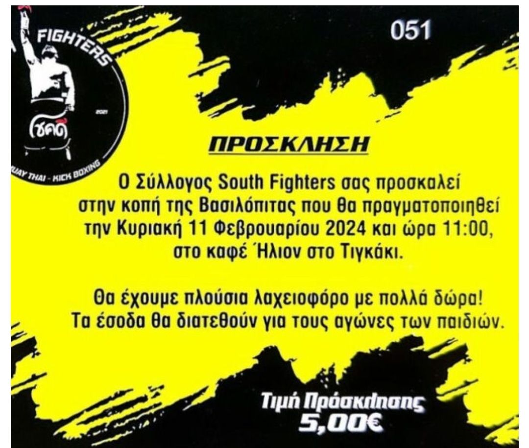 O σύλλογος South Fighters σας προσκαλεί στην κοπή της βασιλόπιτας που θα πραγματοποιηθεί την Κυριακή 11 Φεβρουαρίου 2024 και ώρα 11:00 στο καφέ Ήλιον στο Τιγκάκι. Θα έχουμε πλούσιο λαχειοφόρο με πολλά δώρα. Τα έσοδα θα διατεθούν για τους αγώνες των παιδιών.