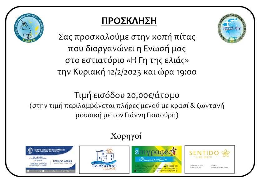 Share Facebook Twitter LinkedIn Pinterest Email Κοπή Βασιλόπιτας ‘Ενωσης Συνοριοφυλάκων στην «Γη της Ελιάς» Βασιλόπιτα