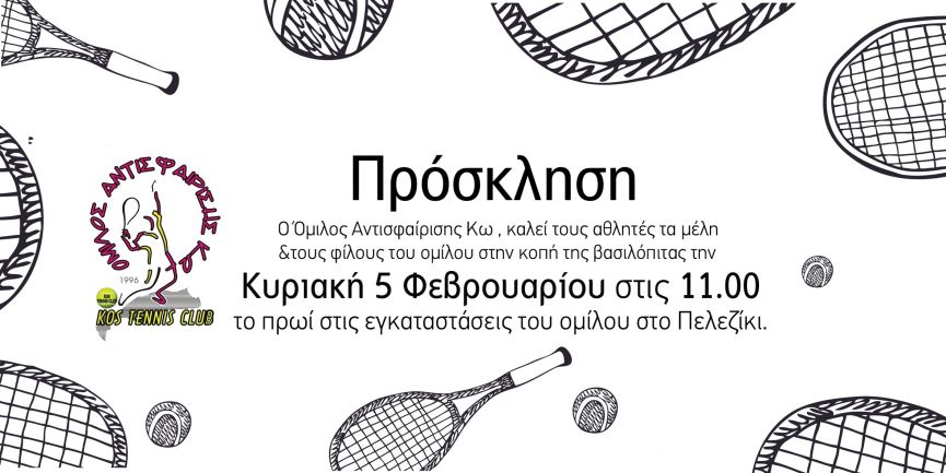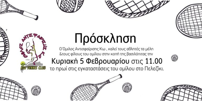 Share Facebook Twitter LinkedIn Pinterest Email Ο Όμιλος Αντισφαίρισης Κω, καλεί τους αθλητές τα μέλη & τους φίλους του ομίλου στην κοπή της βασιλόπιτας την Κυριακή 5 Φεβρουαρίου στις 11.00 το πρωί στις εγκαταστάσεις του ομίλου στο Πελεζίκι. Όμιλος Αντισφαίρισης Κω