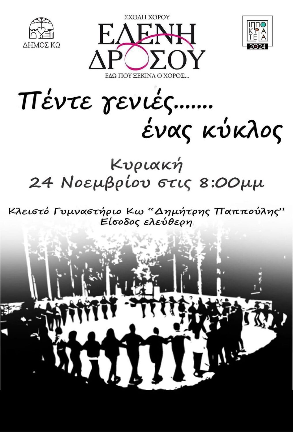 Share Facebook Twitter LinkedIn Pinterest Email ΚΥΡΙΑΚΗ 24/11/24 «ΠΕΝΤΕ ΓΕΝΙΕΣ … … ΕΝΑΣ ΚΥΚΛΟΣ» από τη ΣΧΟΛΗ ΧΟΡΟΥ ΕΛΕΝΗΣ ΔΡΟΣΟΥ ΚΛΕΙΣΤΟ ΓΥΜΝΑΣΤΗΡΙΟ ΚΩ «ΔΗΜΗΤΡΗΣ ΠΑΠΠΟΥΛΗΣ», ΩΡΑ ΕΝΑΡΞΗΣ: 20:00 Παράσταση με ελληνικούς παραδοσιακούς χορούς και Λάτιν. ΤΜΗΜΑ ΠΟΛΙΤΙΣΜΟΥ ΔΗΜΟΥ ΚΩ