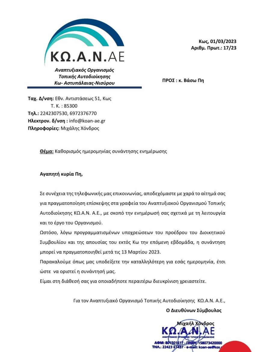 «Προσπαθήσαμε να επικοινωνήσουμε με την ΚΩΑΝ για να έχουμε σήμερα 2/3/2023 συνάντηση – ενημέρωση για όσα «κάνει» η εν λόγω εταιρεία.
