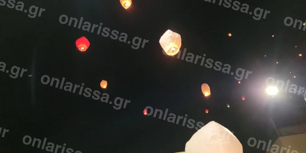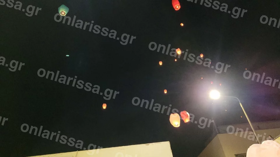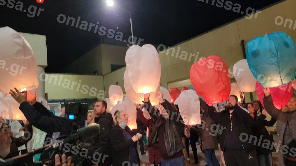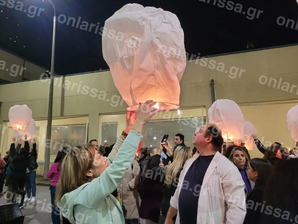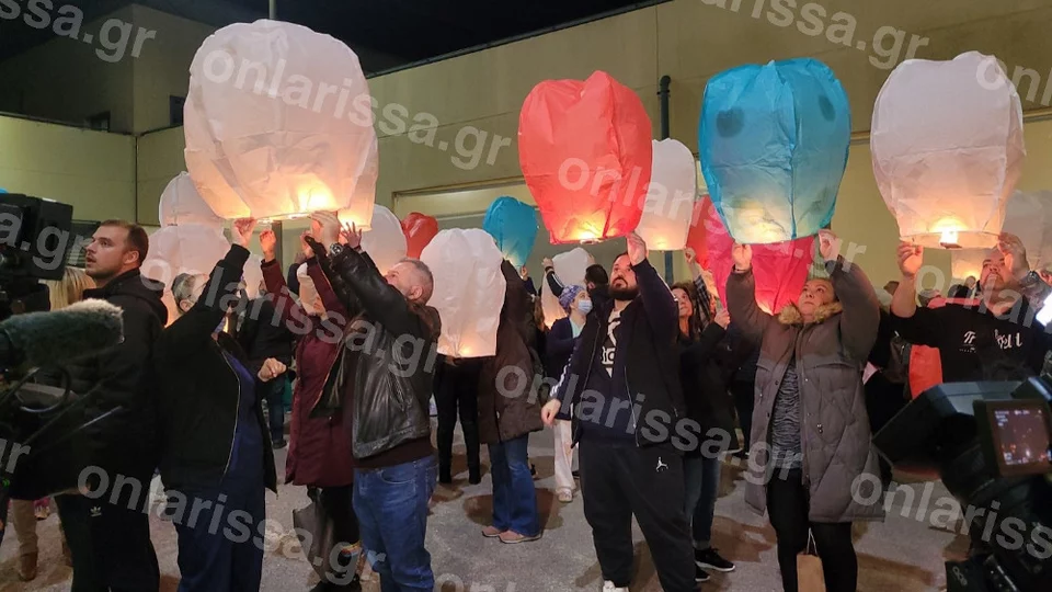 Ο ουρανός πάνω από το Πανεπιστημιακό Νοσοκομείο της Λάρισας γέμισε με αναμμένα φαναράκια, μια εβδομάδα μετά τη τραγωδία στα Τέμπη