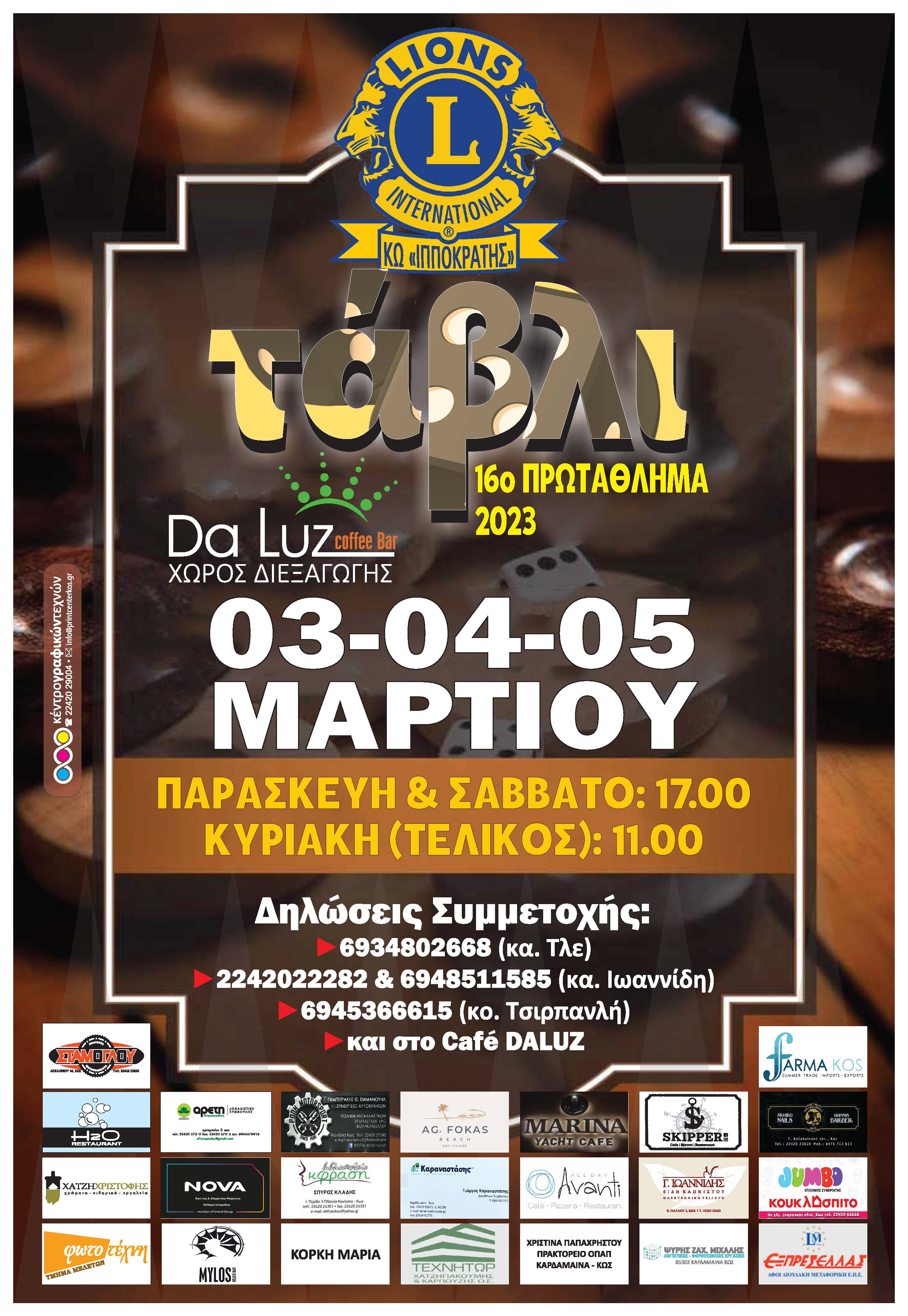 Για 16η χρονιά η Λέσχη Lions Κω «Ο Ιπποκράτης» διοργανώνει πρωτάθλημα τάβλι στο Coffee Bar Da Luz, την Παρασκευή 3/3, Σάββατο 4/3 στις 17:00 και την Κυριακή 5/3 στις 11:00 ο μικρός και μεγάλος τελικός.