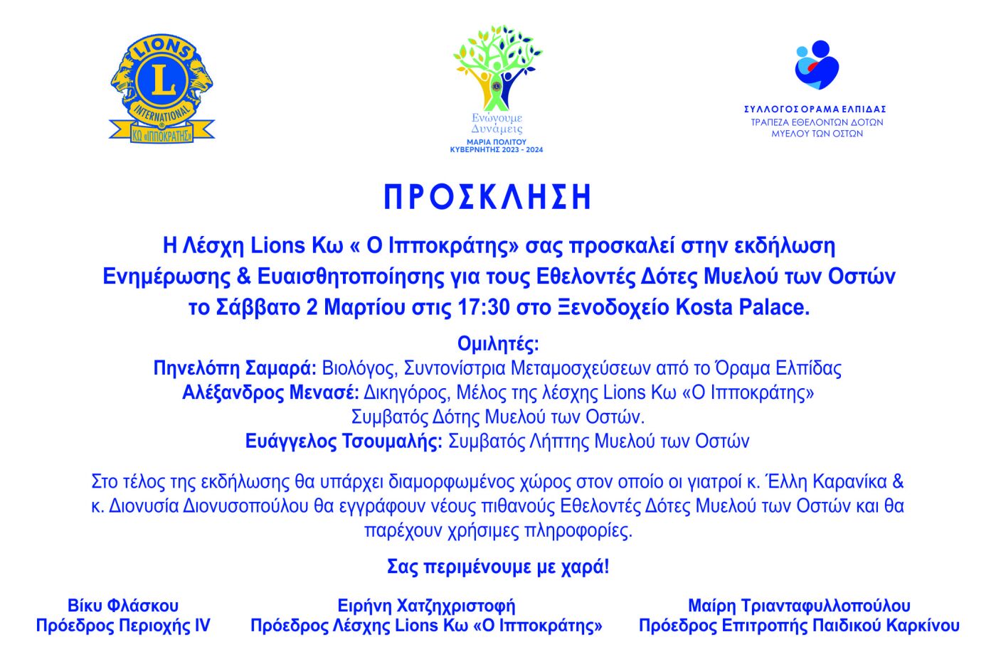 Δράσεων των Lions, οργανώνουμε εκδήλωση το Σάββατο 2 Μαρτίου, στις 17:30, στο ξενοδοχείο “ Kosta Palace Hotel” με σκοπό την