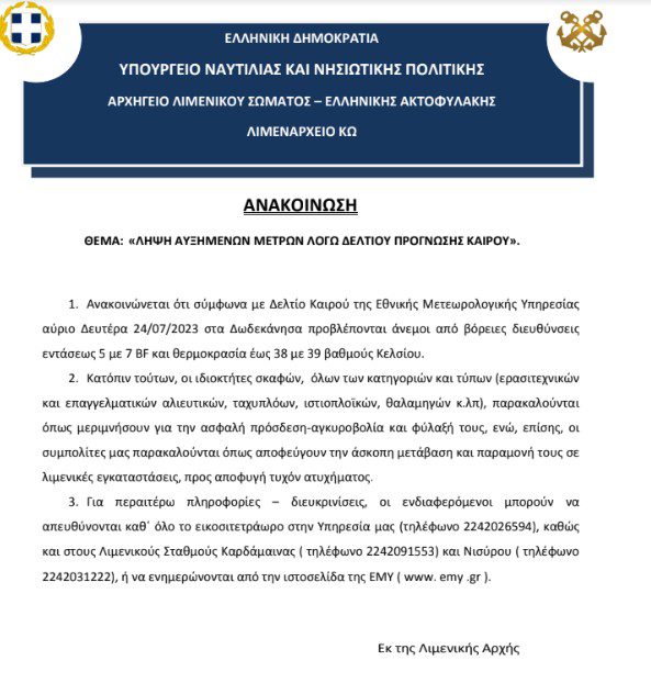 Λιμεναρχείο Κω: Λήψη αυξημένων μέτρων λόγω πρόγνωσης καιρού