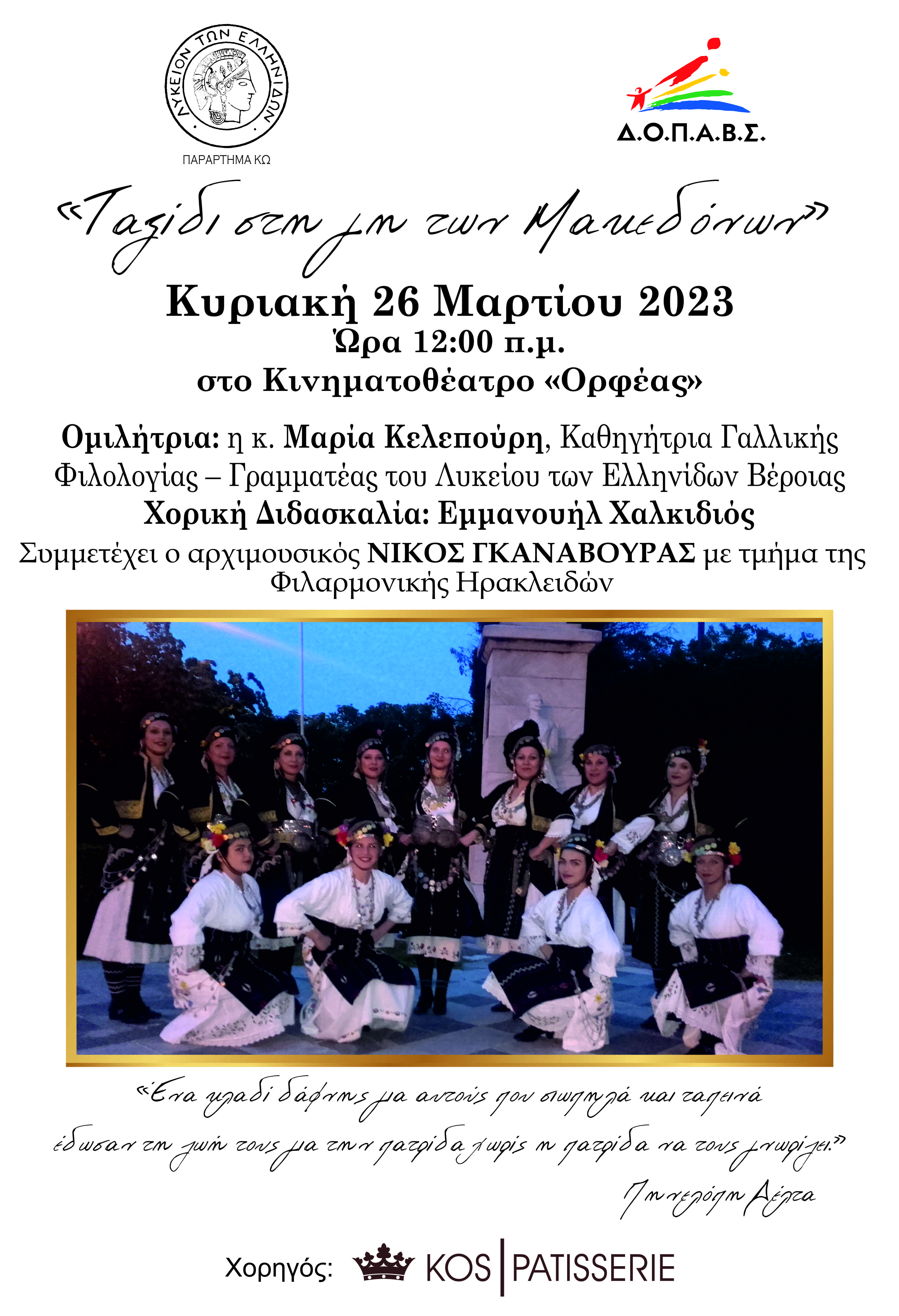 Το Λύκειο Ελληνίδων Παράρτημα Κω σε συνεργασία με τον ΔΟΠΑΒΣ διοργανώνει εκδήλωση με τίτλο «Ταξίδι στη γη των Μακεδόνων» την Κυριακή 26 Μαρτίου ώρα 12:00 στον Χειμερινό Κινηματογράφο «Ορφέα»