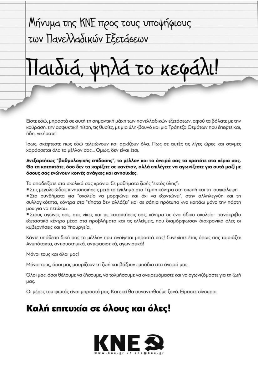 Ανεξαρτήτως “βαθμολογικής επίδοσης”, το μέλλον και τα όνειρά σας τα κρατάτε στα χέρια σας. Θα τα κατακτάτε, όσο δεν τα χαρίζετε σε κανέναν, αλλά επιλέγετε να αγωνίζεστε για αυτά μαζί με όσους σας ενώνουν κοινές ανάγκες και ανησυχίες.