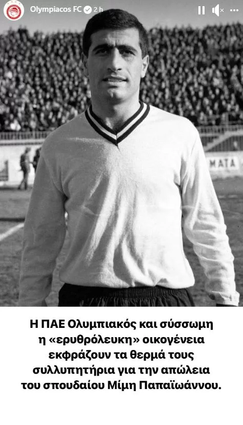 «Η ΠΑΕ Ολυμπιακός και σύσσωμη η “ερυθρόλευκη” οικογένεια εκφράζουν τα θερμά τους συλλυπητήρια για την απώλεια του σπουδαίου Μίμη Παπαϊωάννου», αναφέρει μέσω ανάρτησης η πειραϊκή ΠΑΕ.