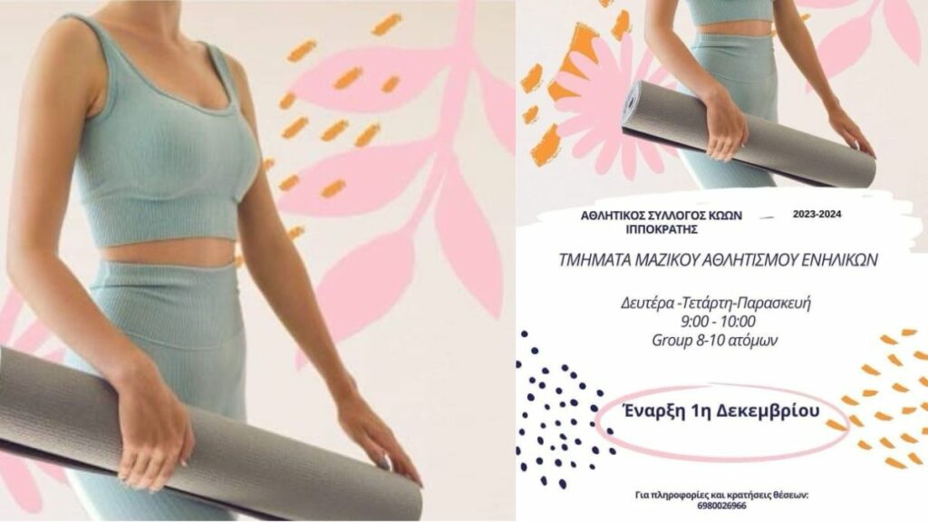”Ο Α.Σ. Κώων Ιπποκράτης ανακοινώνει την έναρξη μαζικού αθλητισμού ενηλίκων.Υπεύθυνη προγράμματος η καθηγήτρια φυσικής αγωγής και μέλος του συλλόγου Σεμίνα Μπαλατινού”.