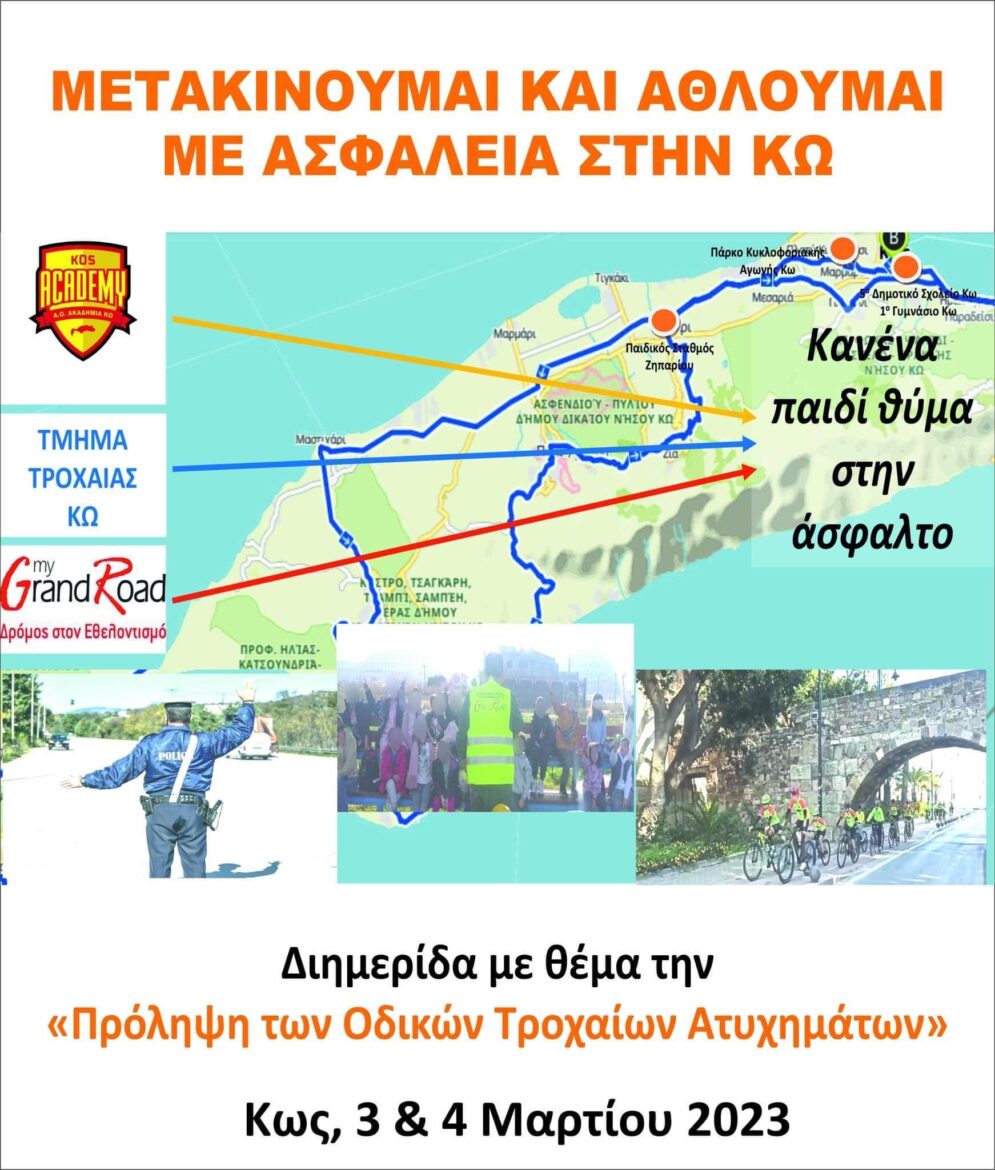 Το σωματείο Αθλητικός Όμιλος Ακαδημία Κω (KOS ACADEMY SPORTS CLUB) έχοντας ως πρόθεση την υλοποίηση δράσεων που αφορούν στην οδική ασφάλεια των αθλητών της ποδηλασίας και όχι μόνο, καθώς ένας από τους πυλώνες στους οποίους στηρίζεται το όραμα του σωματείου είναι η οδική ασφάλεια, την Παρασκευή και το Σάββατο 3 και 4 Μαρτίου σε συνεργασία με το Τμήμα Τροχαίας Κω και τη Μη Κυβερνητική Οργάνωση My Grand Road, θα υλοποιήσει δράση με την επωνυμία «Μετακινούμαι και Αθλούμαι στην Κω, με Ασφάλεια».