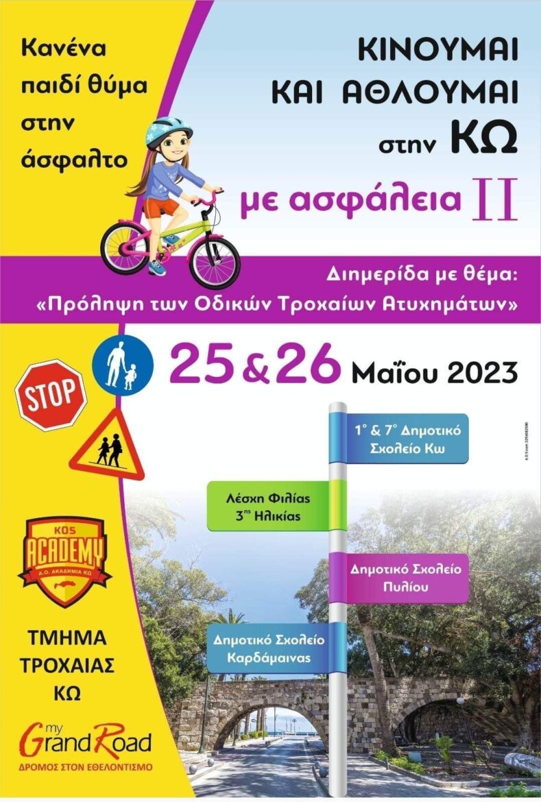 Συνεχίζοντας τις δράσεις που αφορούν στην οδική ασφάλεια και την ασφάλεια του κάθε ποδηλάτη κατά τη χρήση του ποδηλάτου σε κάθε του έκφανση, ο Αθλητικός Όμιλος Ακαδημία Κω (KOS ACADEMY SPORTS CLUB) την Πέμπτη και Παρασκευή 25 και 26 Μαΐου 2023, σε συνεργασία με το Τμήμα Τροχαίας Κω και τη Μη Κερδοσκοπική Οργάνωση «My Grand Road», θα υλοποιήσει για δεύτερη φορά τη φετινή χρονιά, τη δράση με την επωνυμία «Μετακινούμαι και Αθλούμαι στην Κω με Ασφάλεια».