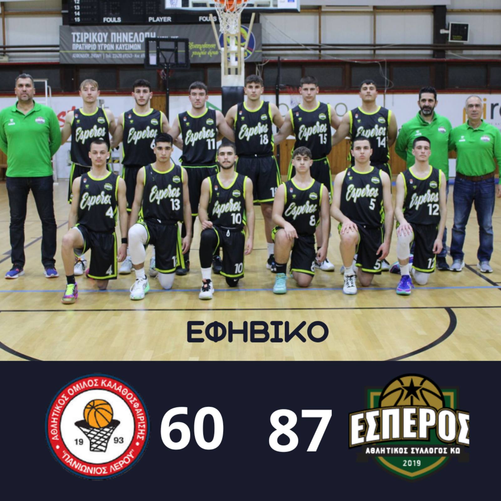 Με 14 νίκες σε 14 αγώνες και έχοντας την καλύτερη επίθεση 1229 και την καλύτερη άμυνα 640 στο όμιλο νήσων, ολοκλήρωσε τις υποχρεώσεις της στο πρωτάθλημα, η εφηβική ομάδα του Έσπερου κερδίζοντας με 87-60 τον Πανιώνιο στη Λέρο.