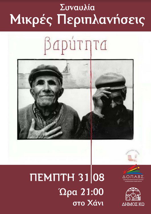 Στο πλαίσιο των θερινών Ιπποκρατείων 2023 ο ΔΟΠΑΒΣ ΚΩ διοργανώνει μουσική εκδήλωση με τις Μικρές Περιπλανήσεις με τίτλο «ΒΑΡΥΤΗΤΑ» την Πέμπτη 31 Αυγούστου στις 21:00 στο Ιστορικό Λαογραφικό Μουσείο (ΧΑΝΙ).