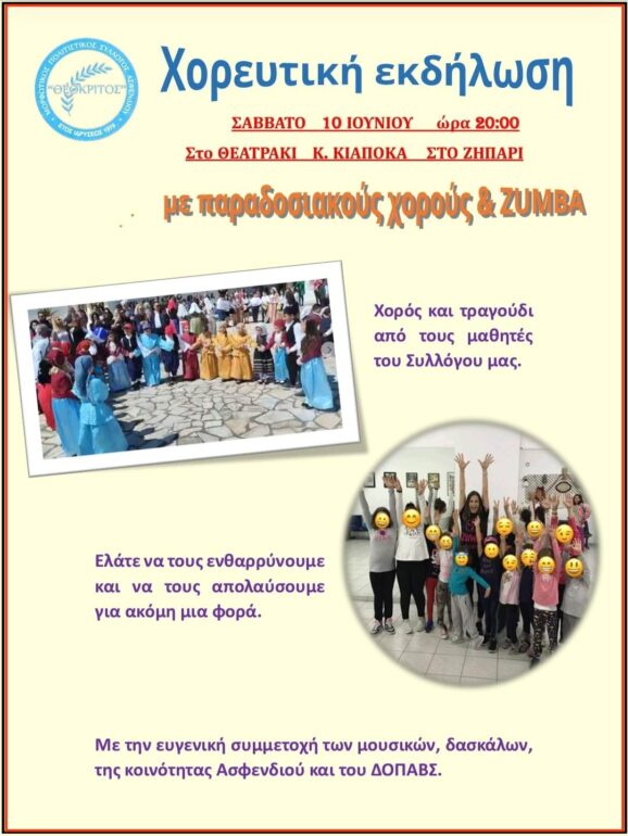Ο Μορφωτικός Πολιτιστικός Σύλλογος Ασφενδιού «Θεόκριτος» με την συνδρομή του ΔΟΠΑΒΣ διοργανώνει μουσική εκδήλωση με παραδοσιακούς χορούς και Zumba το Σάββατο 10 Ιουνίου στις 20:00 στο Θεατράκι Κ. Κιαπόκα στο Ζηπάρι.