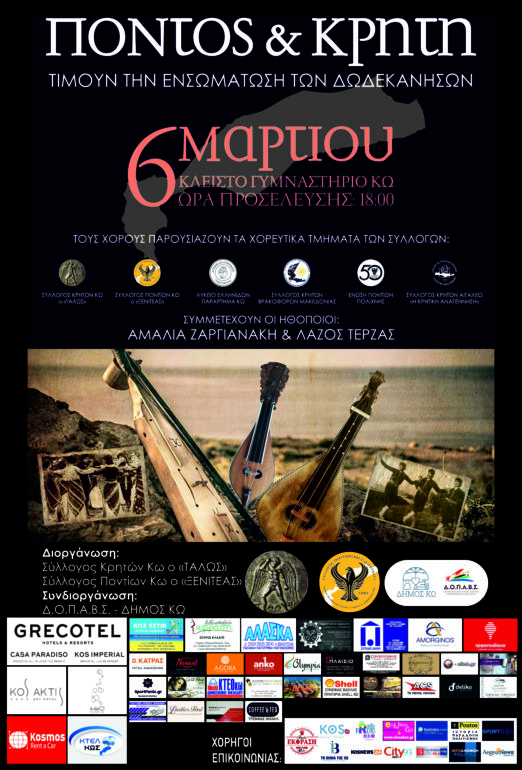 Με αφορμή τον εορτασμό για την ενσωμάτωση των Δωδεκανήσων με την μητέρα Ελλάδα, ο Σύλλογος Κρητών Κω, «ο Τάλως», σε συνεργασία με τον Σύλλογο Ποντίων Κω «ο Ξενιτέας» και με την υποστήριξη του Δ.Ο.Π.Α.Β.Σ. Δήμου Κω,