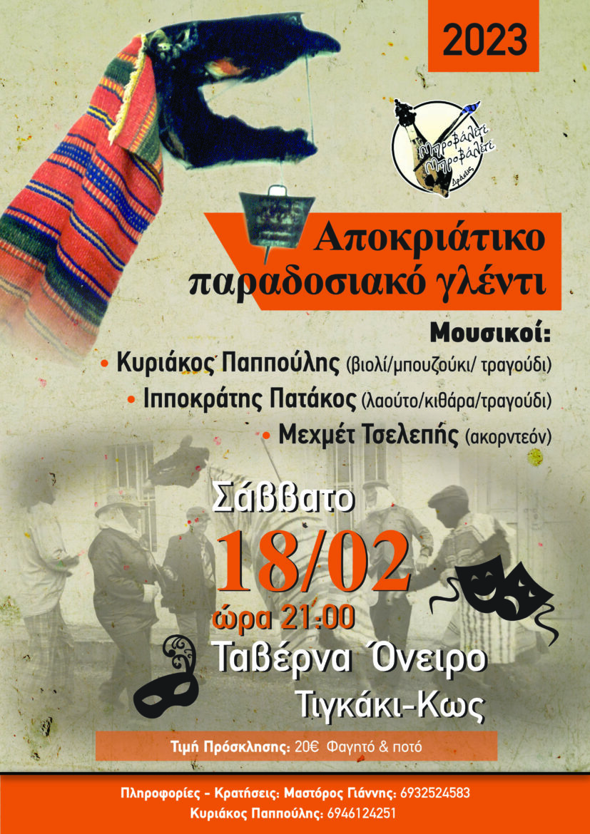 Share Facebook Twitter LinkedIn Pinterest Email Άλλη μία δράση μας, άλλο ένα γλέντι μας με έμφαση στην μουσικοχορευτική παράδοση του τόπου μας, αλλά και της ευρυτερης περιοχής. Αναβίωση εθίμων, δρώμενων, κέφι και πολύ χορό! Καλώς να ανταμώσουμε Κως