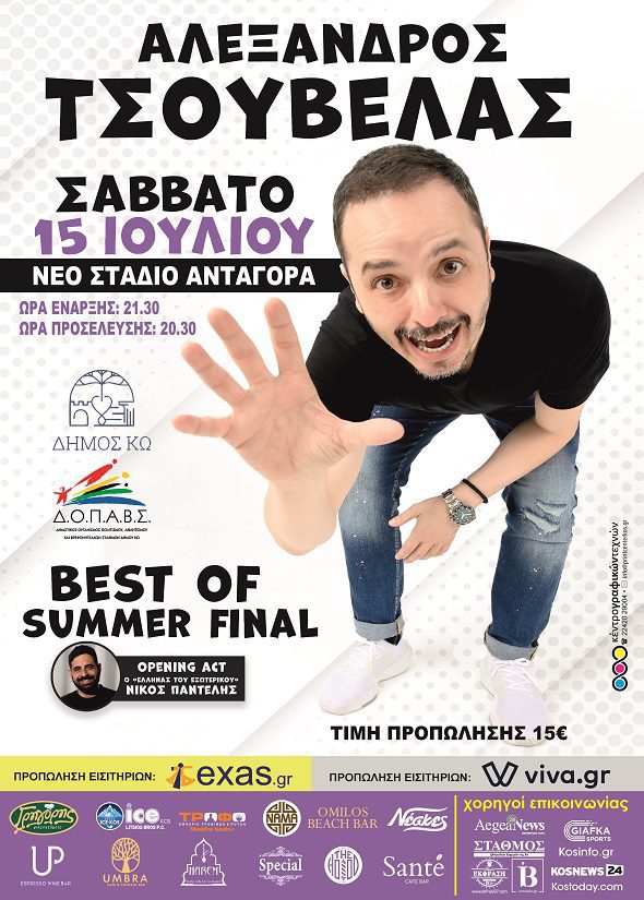 Και ο Αλέξανδρος Τσουβέλας επιστρέφει στο νησί της Κώ τo Σάββατο 15 Ιουλίου για το “BEST OF” Summer Final Tour, με τα καλύτερά κείμενα της πολυετούς πορείας του εμπλουτισμένα με προσωπικά του βιώματα και ιστορίες απείρου κάλλους!