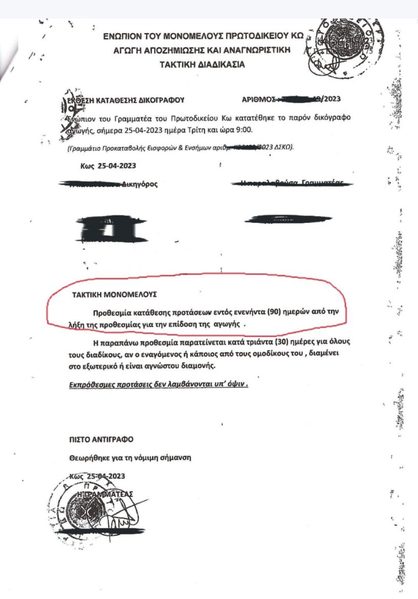 Σημείωση: σας αποστέλλουμε την πρώτη σελίδα από την αγωγή αποζημίωσης που κατατέθηκε στις 25/4/2023.