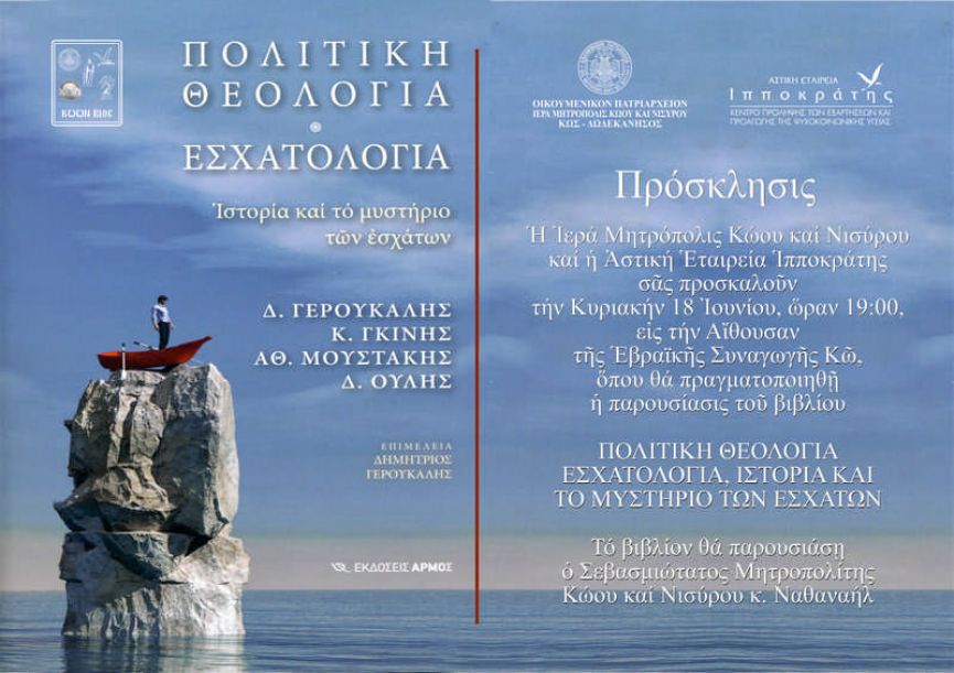 Την Κυριακή, 18 Ιουνίου εε, και ώρα 19:00, εις την αίθουσα της Εβραϊκής Συναγωγής, θα παρουσιασθεί το βιβλίο ΠΟΛΙΤΙΚΗ ΘΕΟΛΟΓΙΑ – ΕΣΧΑΤΟΛΟΓΙΑ, ΙΣΤΟΡΙΑ ΚΑΙ ΤΟ ΜΥΣΤΗΡΙΟ ΤΩΝ ΕΣΧΑΤΩΝ.