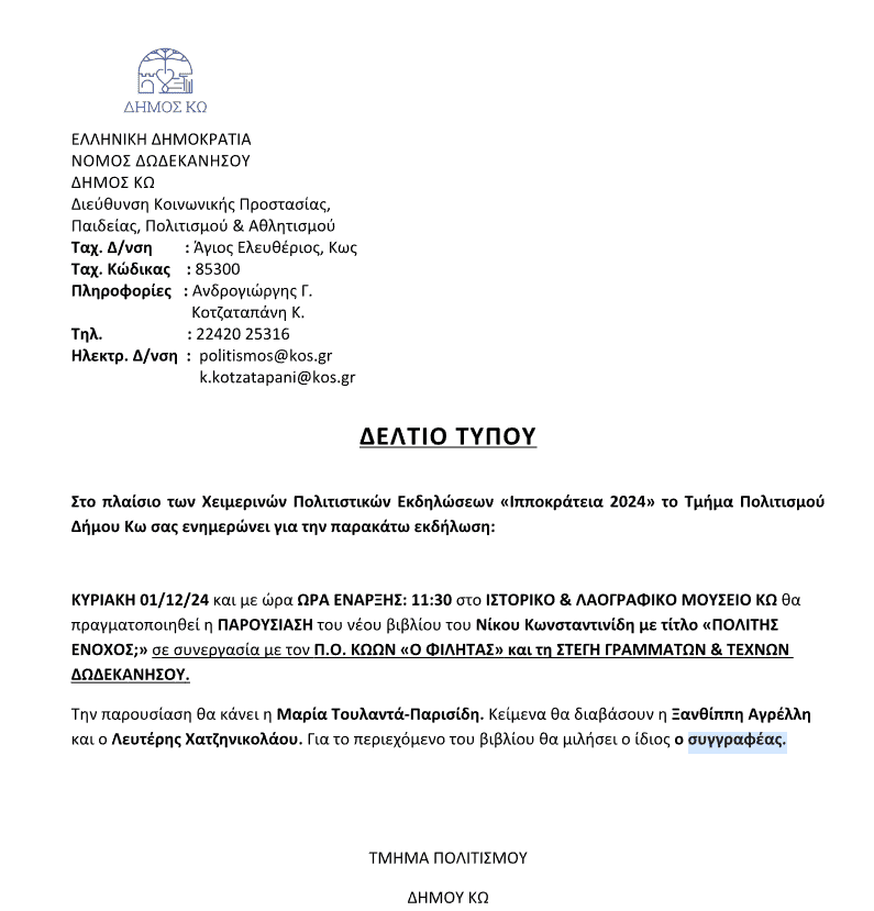 ΠΑΡΟΥΣΙΑΣΗ ΒΙΒΛΙΟΥ ΜΕ Π.Ο. ΚΩΩΝ “ΟΦΙΛΗΤΑΣ”
