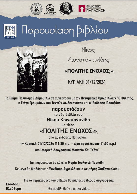Home»ΡΟΗ ΕΙΔΗΣΕΩΝ»ΠΑΡΟΥΣΙΑΣΗ ΒΙΒΛΙΟΥ ΜΕ Π.Ο. ΚΩΩΝ “ΟΦΙΛΗΤΑΣ”