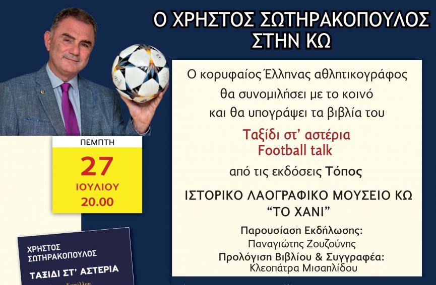 Εκδήλωση για την παρουσίαση των βιβλίων του κορυφαίου Έλληνα αθλητικογράφου Χρήστου Σωτηρακόπουλου με τίτλο ‘’ Ταξίδι στ΄ αστέρια ‘’ H ιστορία του κυπέλλου Πρωταθλητριών – Champion League (1956-2021) και ‘’FOOTBALL TALK’’ Κουβέντα με τους σταρ για μπάλα και…άλλα διοργανώνουν ο ΔΟΠΑΒΣ , οι Εκδόσεις Τόπος και το Βιβλιοπωλείο Έκφραση στα Θερινά Ιπποκράτεια 2023 την Πέμπτη 27 Ιουλίου στις 8 το βράδυ στο Ιστορικό και Λαογραφικό Μουσείο Κω (Χάνι).