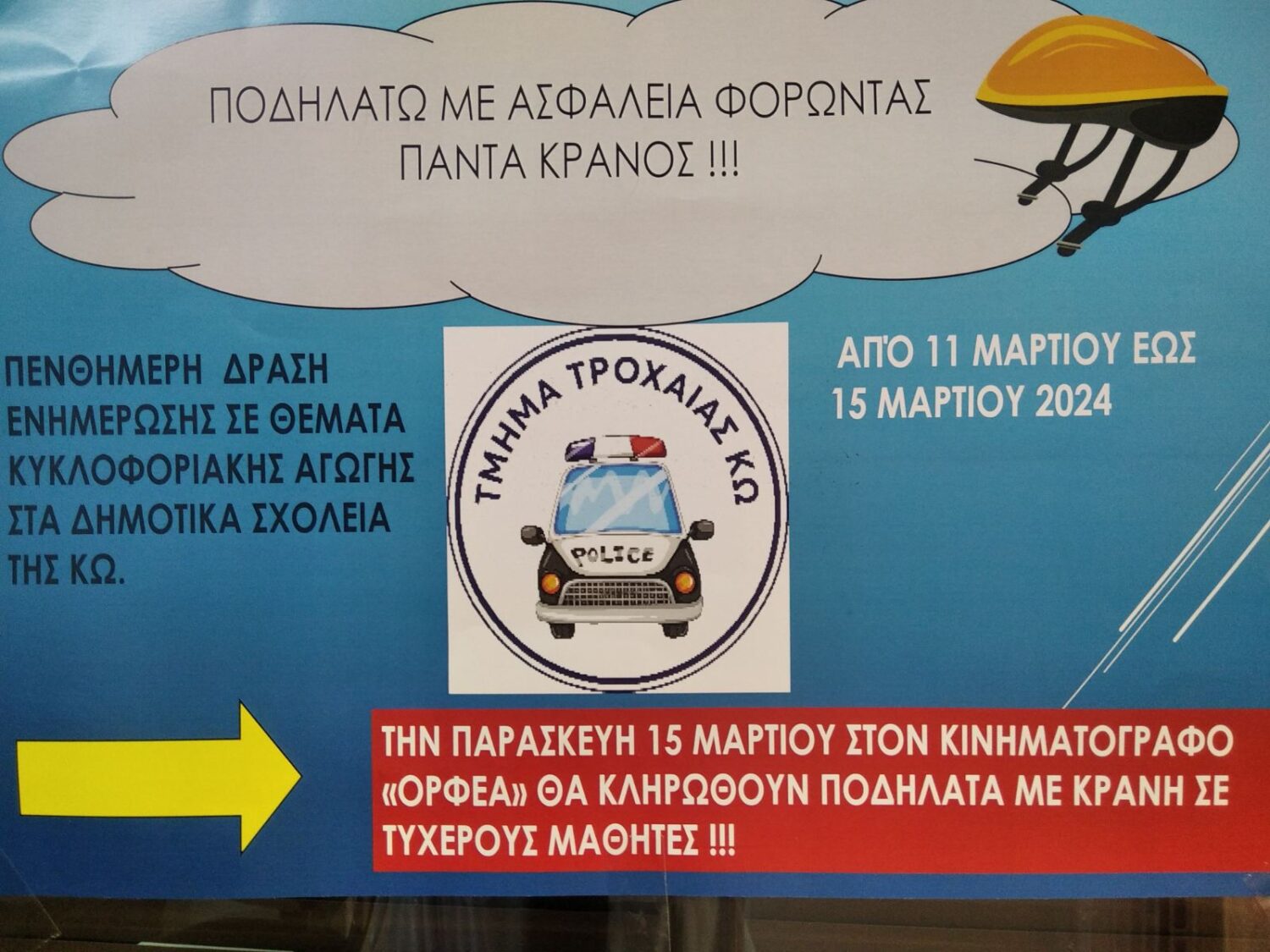 Θα θέλαμε να σας ενημερώσουμε ότι το Τμήμα Τροχαίας Κω διοργανώνει πενθήμερη εκπαιδευτική δράση η οποία θα πραγματοποιηθεί από Δευτέρα 11 Μαρτίου έως και Παρασκευή 15 Μαρτίου 2024 στα Δημοτικά σχολεία της Κω. Η δράση θα περιλαμβάνει ενημέρωση των μαθητών σε θέματα οδικής ασφάλειας και κυκλοφορικής αγωγής από έμπειρους Αστυνομικούς της Υπηρεσίας μας στα σχολεία τους κατά την διάρκεια των ωρών του σχολείου με στόχο την αναβάθμιση του επιπέδου της οδικής ασφάλειας, την ασφαλή μετακίνηση των μαθητών καθώς και την πρόληψη των τροχαίων ατυχημάτων.