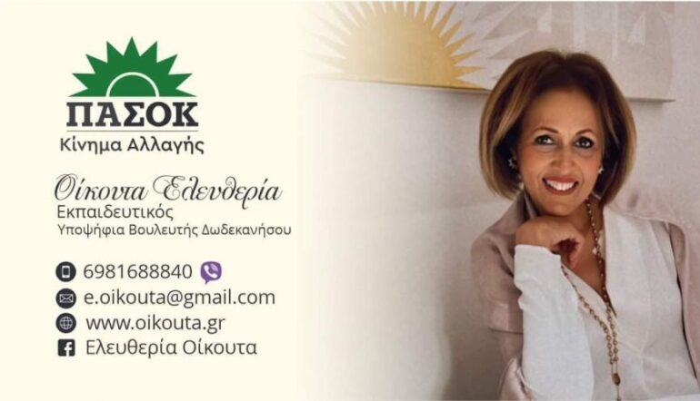 Περιοδεία στα νησιά του βορείου συγκροτήματος της Δωδεκανήσου ξεκίνησε την Πέμπτη 20 Απριλίου η υποψήφια βουλευτής Δωδεκανήσου με το ΠΑΣΟΚ – Κιναλ Ελευθερία Οίκουτα.