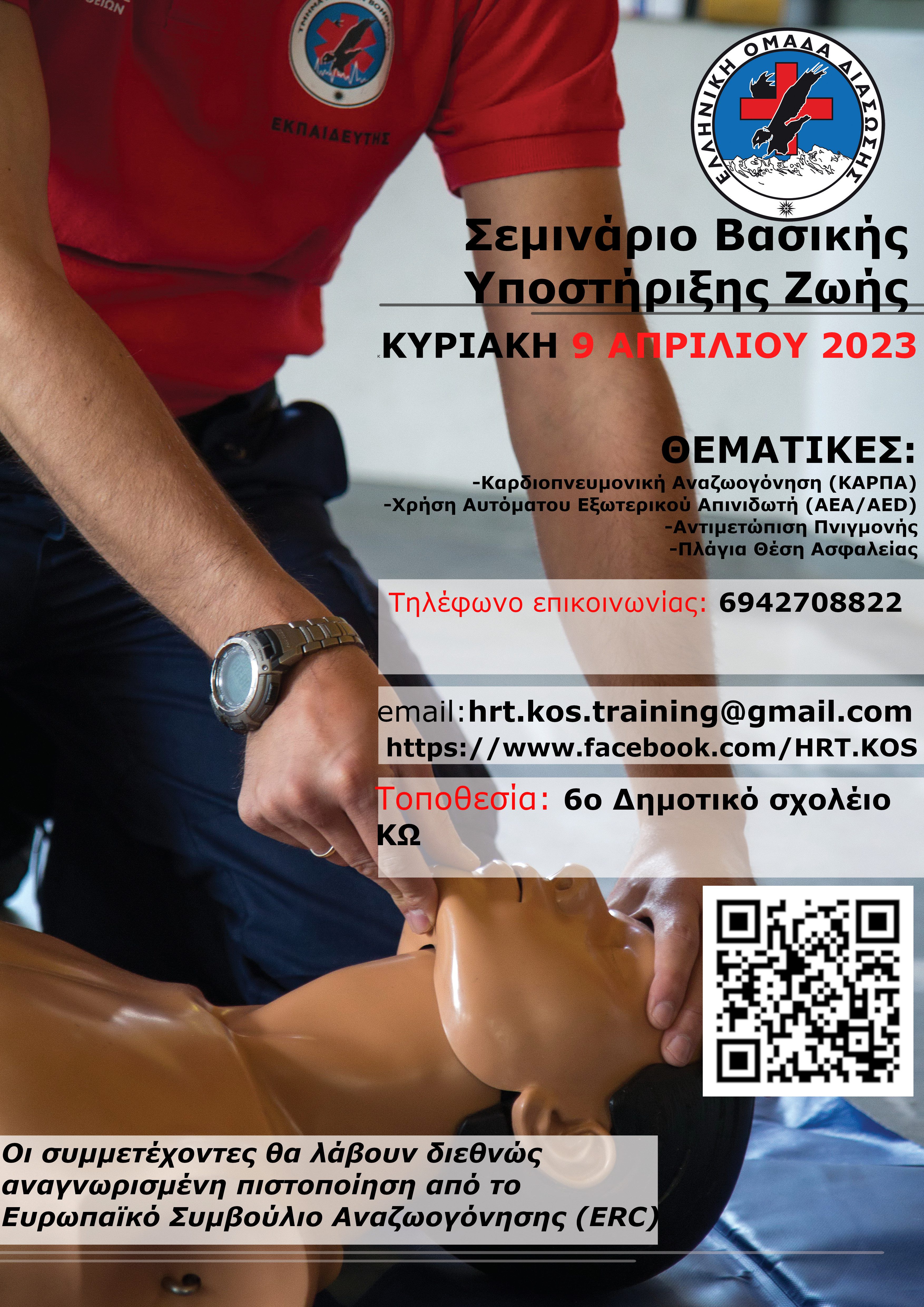 Share Facebook Twitter LinkedIn Pinterest Email Η Ελληνική Ομάδα Διάσωσης Κω πραγματοποιεί σεμινάριο Βασικής Υποστήριξης Ζωής την Κυριακή 9 Απριλίου 2023 στο 6ο Δημοτικό Σχολείο Κω στο Πλατάνι. Για πληροφορίες και συμμετοχές ακολουθήστε το σύνδεσμο ή τον κωδικό QR https://forms.gle/CQ6U7v6qdQfk4oVw5 Ελληνική Ομάδα Διάσωσης