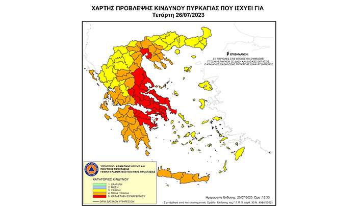 Πυρκαγιάς για αύριο Τετάρτη 26-07-2023. (Σύμφωνα με τον χάρτη Πρόβλεψης η επικινδυνότητα είναι (κατηγορία