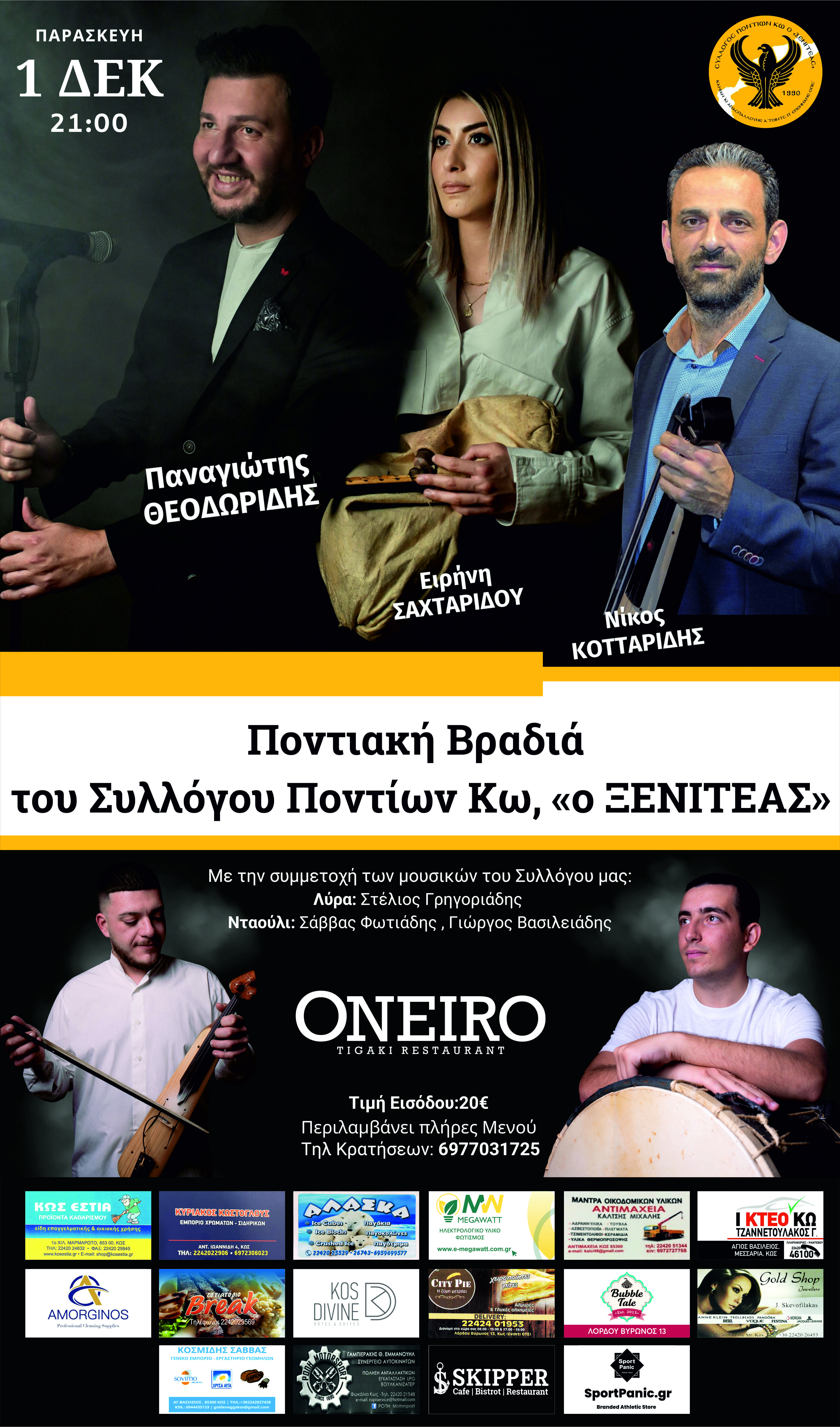 Αγαπητές φίλες και φίλοι, ο Σύλλογος Ποντίων Κω, ο «Ξενιτέας» , διοργανώνει Ποντιακή Βραδιά στις 1 Δεκεμβρίου (21:00) στο Εστιατόριο Όνειρο (Τιγκάκι).