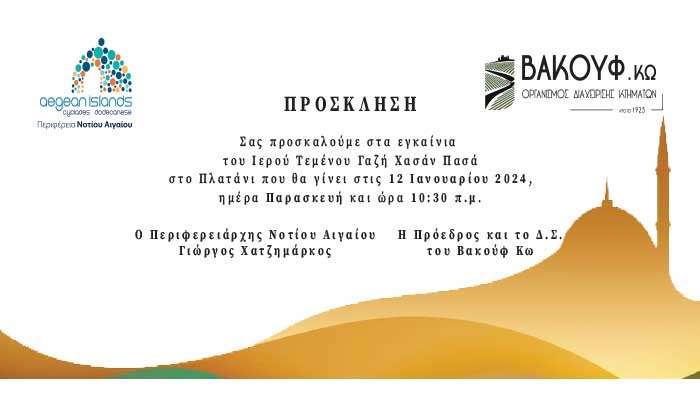 Share Facebook Twitter LinkedIn Pinterest Email Σας προσκαλούμε στα εγκαίνια του Ιερού Τεμένους Γαζή Χασάν Πασά στο Πλατάνι που θα γίνει στις 12 Ιανουαρίου 2024, ήμερα Παρασκευή και ώρα 10:30 π.μ. Με εκτίμηση, Κοτζαογλάν Ελβάν Πρόεδρος του Βακούφ Κω Τηλ. επικοινωνίας: 22420 22436 ΒΑΚΟΥΦ Κω