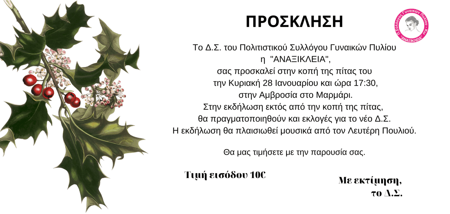 ΠΡΟΣΚΛΗΣΗ: Κοπή πίτας του Πολιτιστικού Συλλόγου Γυναικών Πυλίου η “ΑΝΑΞΙΚΛΕΙΑ”