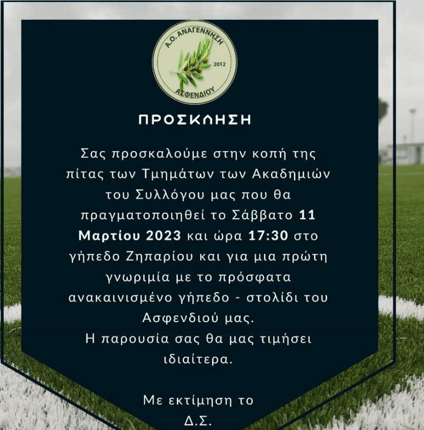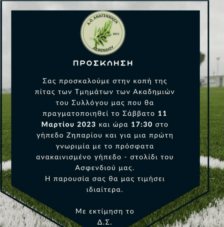 Share Facebook Twitter LinkedIn Pinterest Email Κοπή πίτας των Ακαδημιών Α.Ο Αναγέννησης Ασφενδιού το Σάββατο 11-03-23 Αναγέννηση Ασφενδιού