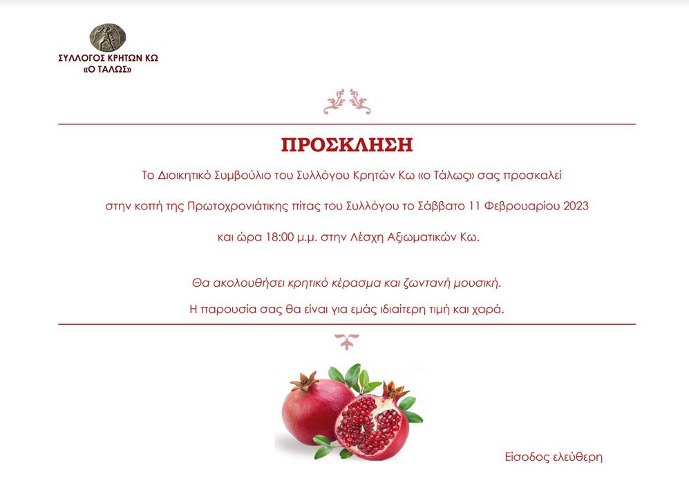 Το Διοικητικό Συμβούλιο του Συλλόγου Κρητών Κω «ο Τάλως» σας προσκαλεί στην κοπή της Πρωτοχρονιάτικης πίτας του Συλλόγου το Σάββατο 11 Φεβρουαρίου 2023 και ώρα 18:00 μ.μ. στην Λέσχη Αξιωματικών Κω.