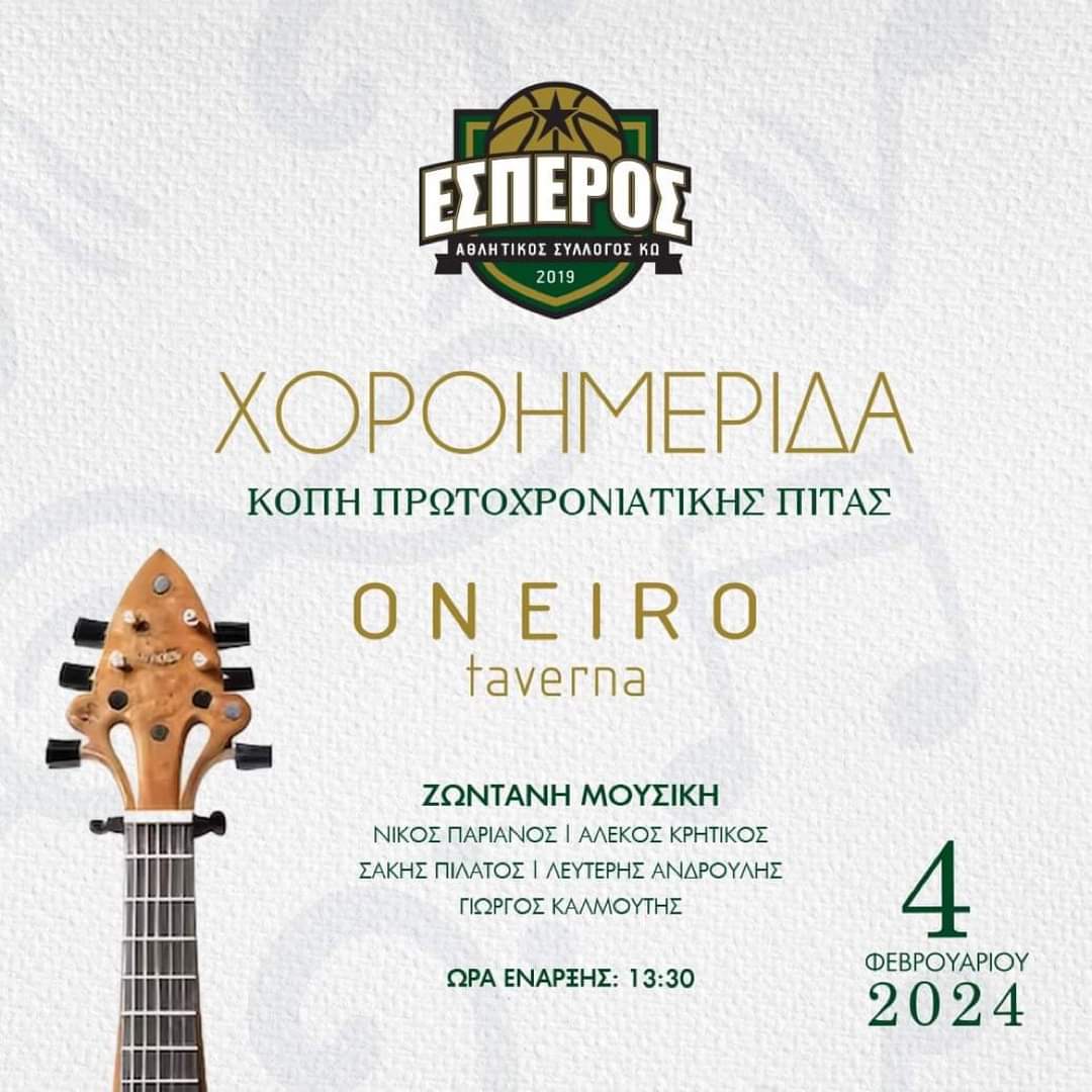 Ο Α.Σ. ΕΣΠΕΡΟΣ Κω σας προσκαλεί στη χοροημερίδα που διοργανώνει, την Κυριακή 4 Φεβρουαρίου στις 13:30, στο εστιατόριο Όνειρο, στο Τιγκάκι, όπου θα κόψει την πρωτοχρονιάτικη πίτα…