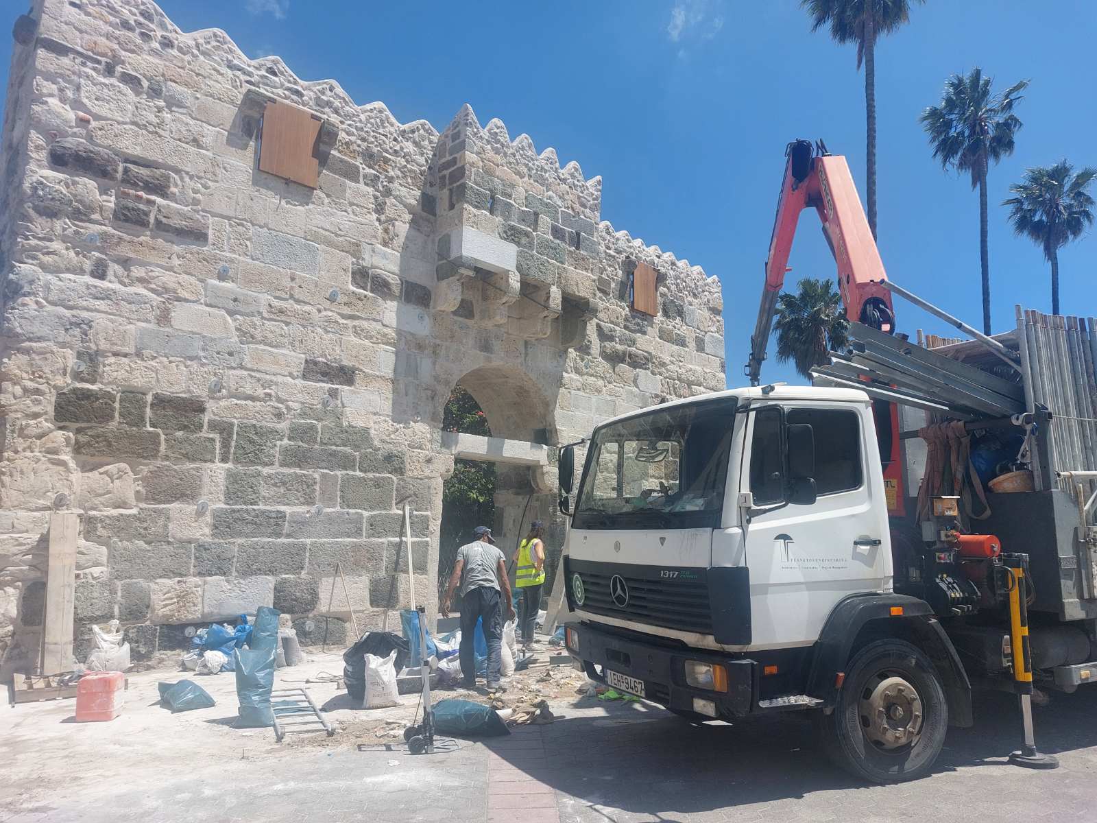 Share Facebook Twitter LinkedIn Pinterest Email Όπως φαίνεται από τις φωτογραφίες προχωρούν οι εργασίες υποστήλωσης της πύλης του φόρου, τμήμα της οποίας κατέρρευσε από τον σεισμό της 21ης Ιουλίου. Πύλη του φόρου